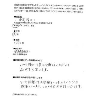 中島淳二様 38歳男性 群馬県高崎市在住 ■治療を終えて一言お願いします。いつも親切・丁寧に治療していただいてありがたく思います。 ■治療全体の感想をお願いします。とても信頼できる治療をいつもしていただき感謝しています。これからもお世話になります。 前の記事 次の記事